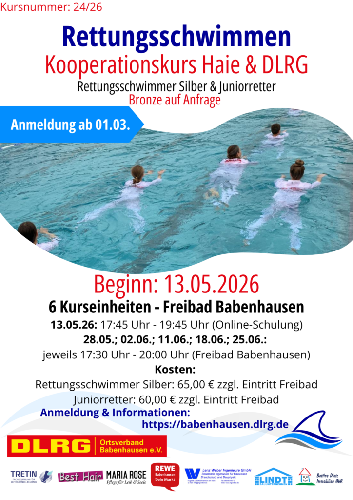 Ab dem 13.05.26 starten wieder zwei Kooperationskurse zum Rettungsschwimmen der Babenhäuser Haie und der DLRG Babenhausen. Der erste Termin findet online statt, alle weiteren Termine in Präsenz im Babenhäuser Freibad.